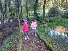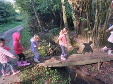 Istraživanjem puteljaka otkrivamo novouređen dio šume s mostom sagrađenim od poprečno položenih debla na kojima djeca uvježbavaju održavanje ravnoteže i balansiranje. Potočić koji prolazi šumom potiče djecu na istraživanje gibanja vode. Bacajući kamečiće i drveni neoblikovani materijal potiče ih na zaključivanje o tome koji materijal pliva, a koji tone. Također mnoštvo grana uz potok potiče ih na simboličku igru poput pecanja, kuhanja različitih napitaka, gusara.